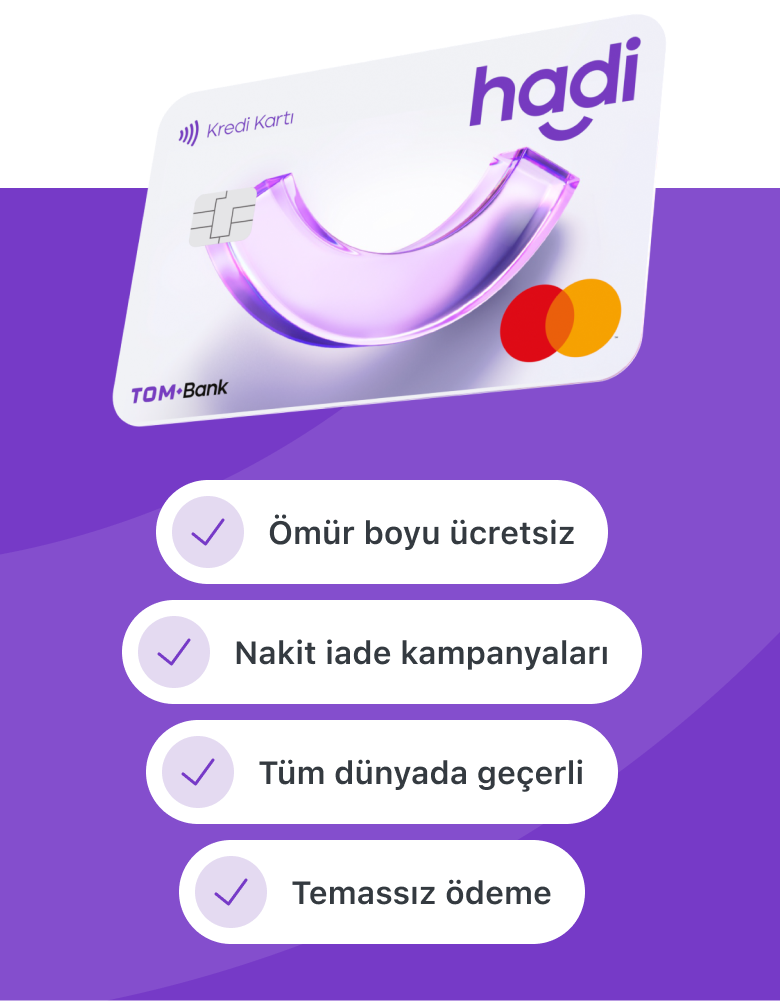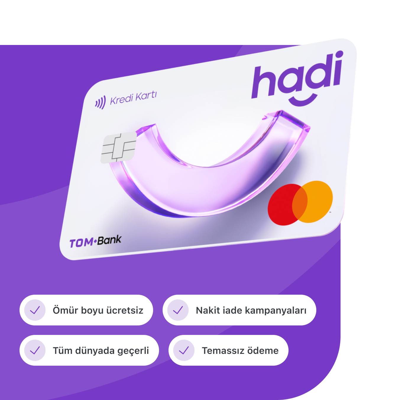 Ömür boyu ücretsiz Hadi Kredi Kartı'na hemen başvur! Tüm dünyada geçerli Hadi Kredi Kartı'nı fiziksel ve online alışverişlerinde güvenle kullanmanın keyfini yaşa! Üstelik A101, English Home ve Eve mağazalarında %10'a varan nakit iadelerle alışverişin tadını çıkar.