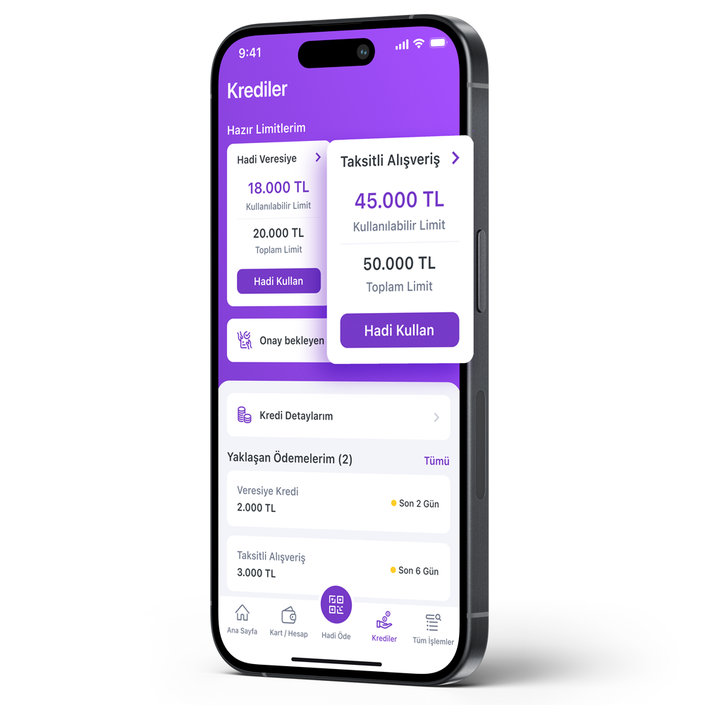 Hadi’de hesabının sınırlarını kendin belirleyebilirsin. İstediğin kadar para yükleyebilir, yüklediğin kadar harcayabilirsin. Ek masraflar olmadan hesabını yönetebilir, dilediğin kartla hesaplarını kontrol altında tutabilirsin.