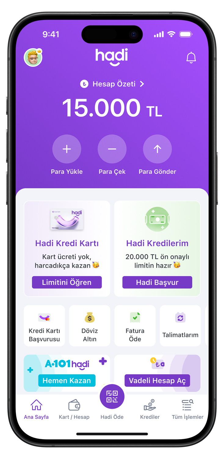 Hadi’de ömür boyu kart aidatı ödemez, bankacılık işlemlerini ücretsiz gerçekleştirir, avantajlı getiri oranlarından yararlanırsın.