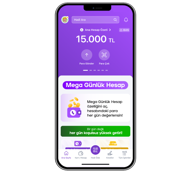 Mega Günlük Hesap ile birikimlerini günlük olarak avantajlı kâra katılma oranlarıyla değerlendirebilir, gün içerisinde tüm bankacılık işlemlerini kolaylıkla gerçekleştirebilirsin.