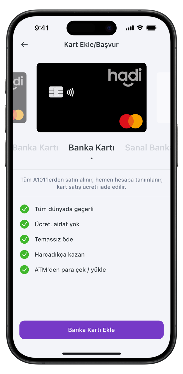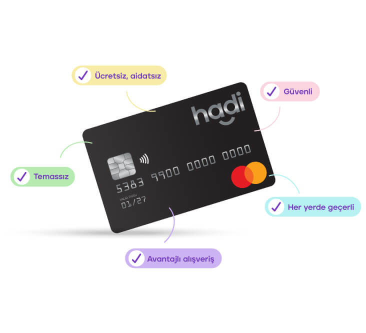 Hadi uygulaması üzerinden ismine özel Hadi Banka Kartı'na ücretsiz başvurabilir, kartını tüm yurt içi, yurt dışı ve internet harcamalarında güvenle kullanabilirsin. Ayrıca tüm A101, Eve ve English Home mağazalarından İsimsiz Hadi Hesap Kartı satın alabilir ve kartını ücretsiz olarak kullanmaya hemen başlayabilirsin.