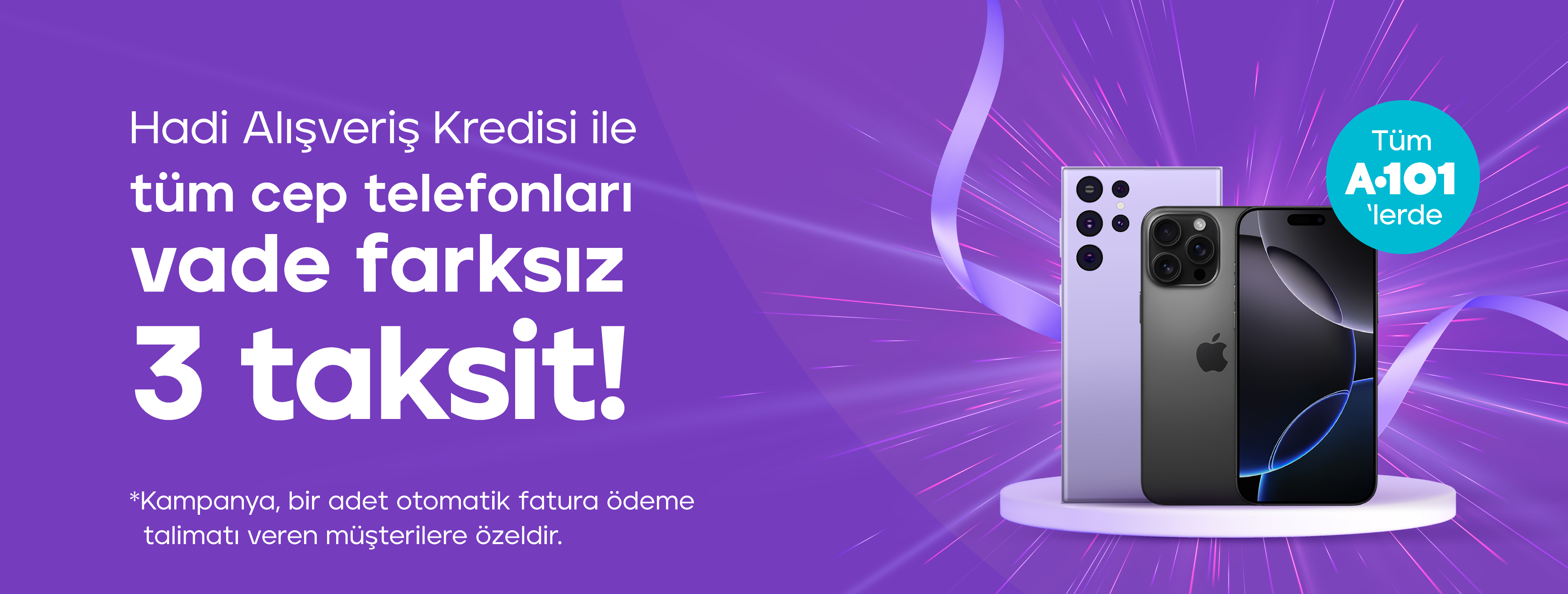 1 Ekim -31 Ekim tarihleri arasında Hadi Alışveriş Kredisi ile A101’den aldığın tüm cep telefonları vade farksız 3 taksit!
