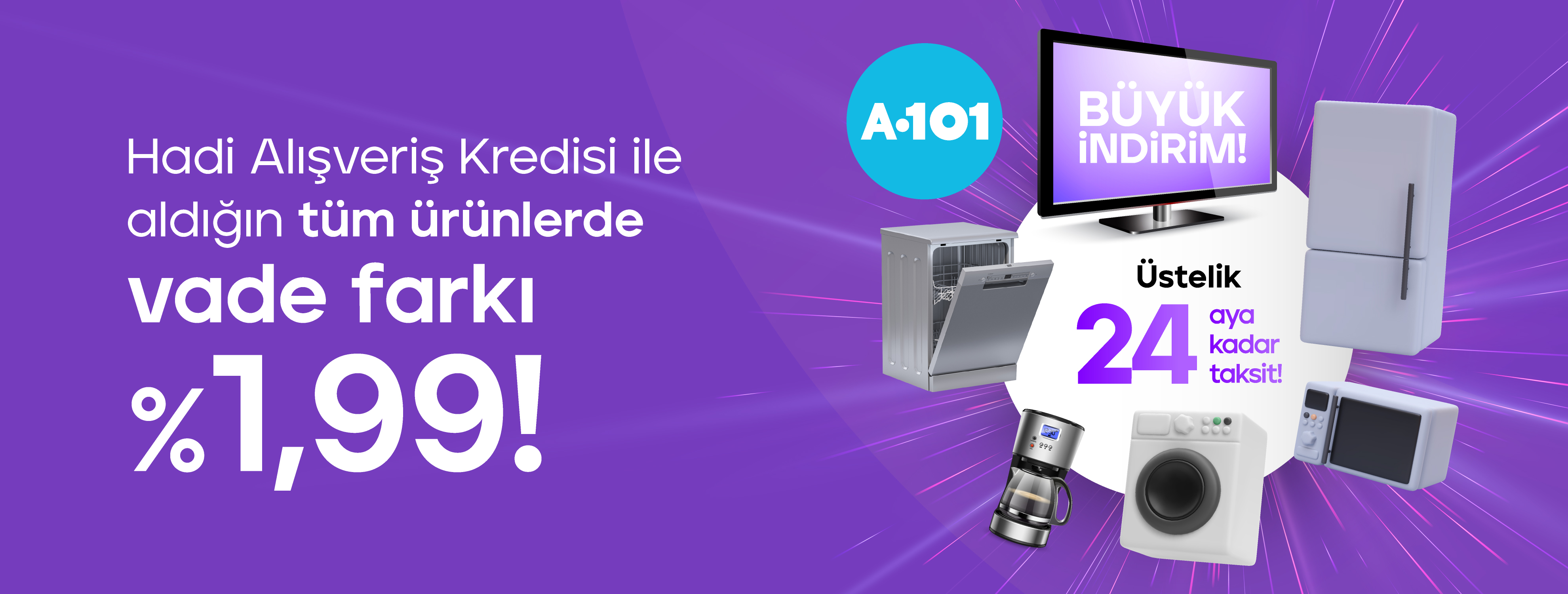 1 Ekim -31 Ekim tarihleri arasında Hadi Alışveriş Kredisi ile A101 mağazalarından ve A101 Online kanallarından aldığın tüm ürünlerde vade farkı %1,99!
