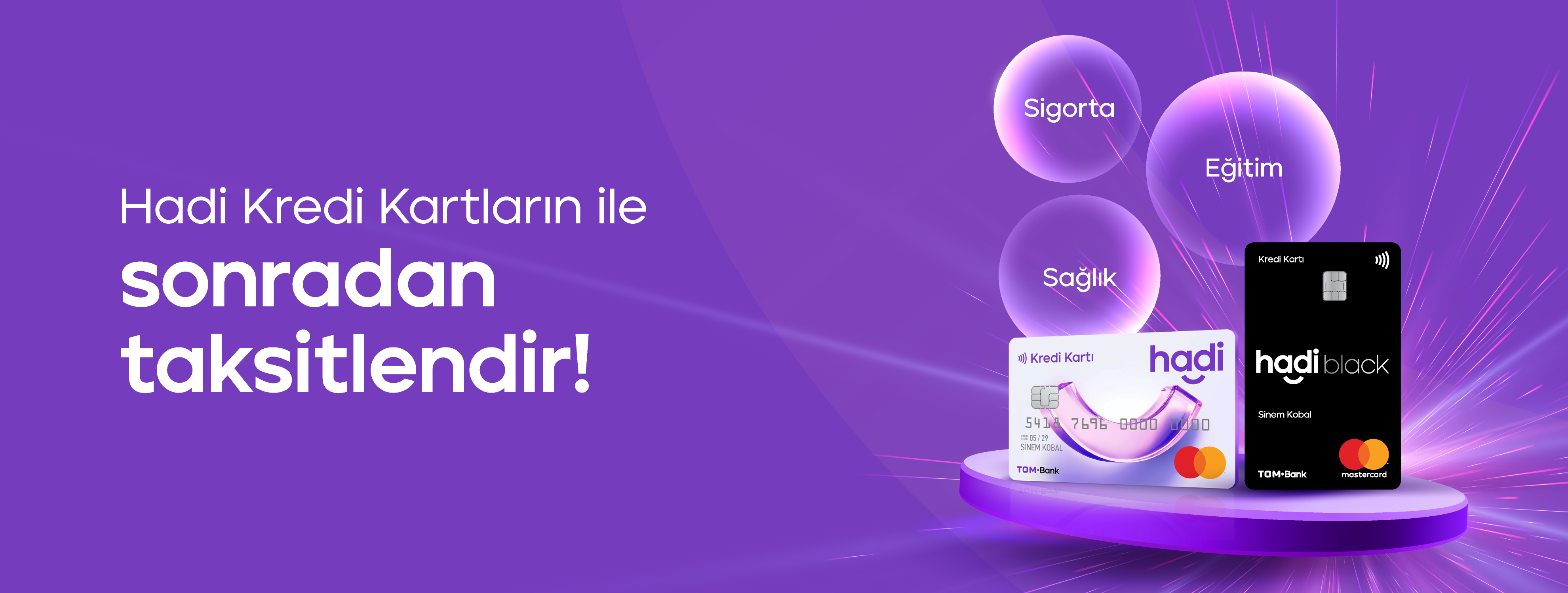 - Hadi Kredi Kartı’n ile Eğitim, Sağlık ve Sigorta sektörlerinde yapılan minimum 100 TL maksimum 50.000 TL tutarındaki yurt içi peşin harcamalarını 12 aya kadar Hadi’den sonradan taksitlendirebilirsin.