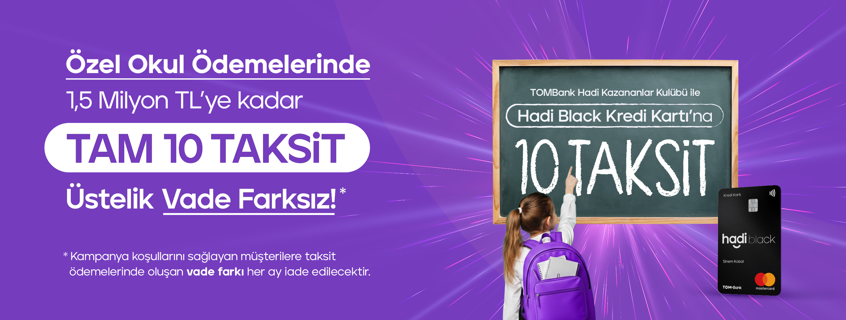 TOM Bank Hadi Kazananlar Kulübü Paketleri ile Hadi Black Kredi Kartı ile yapılacak özel okul ödemelerinde TAM 10 taksit fırsatı! Üstelik vade farksız, hemen paketini seç! Paket detaylarını aşağıdan inceleyebilirsin!