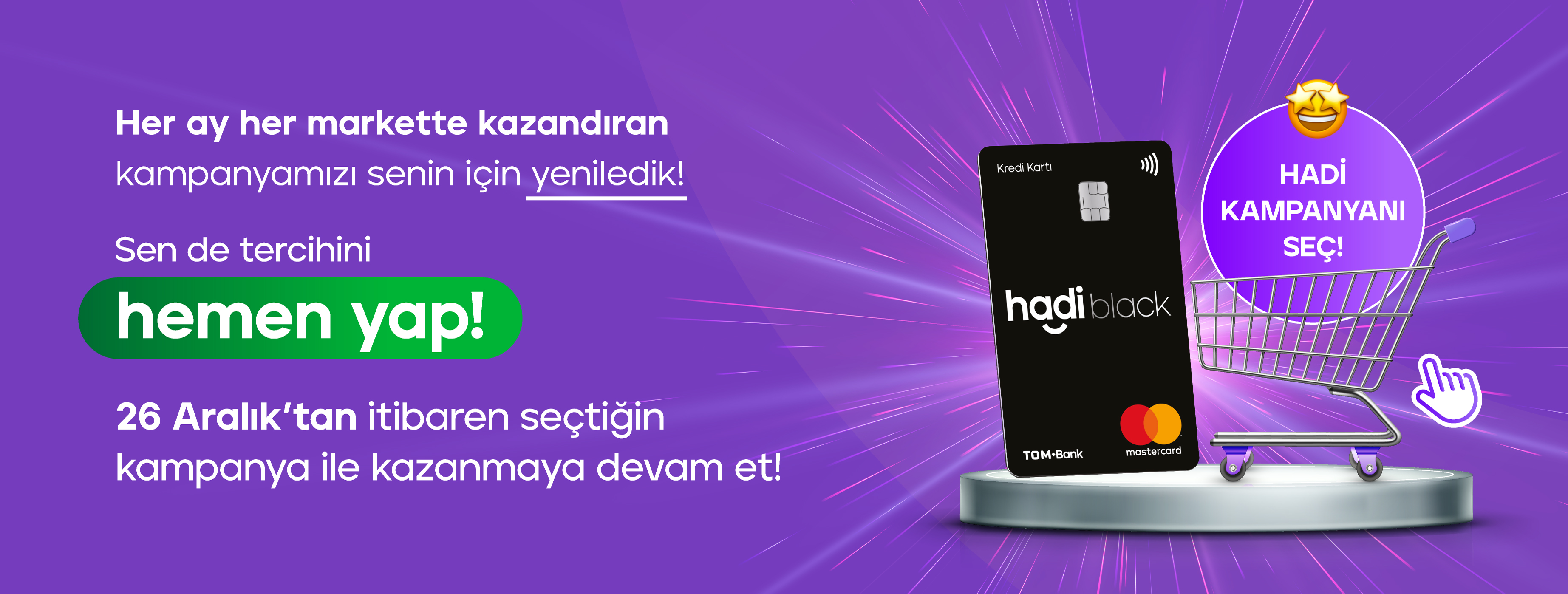 • Üçüncü kampanyayı seçen müşteriler; Hadi Kredi Kartların ile tüm marketlerde geçerli toplamda 15.000 TL ve üstü harcamana 1.000 TL iade kazanabilecektir.